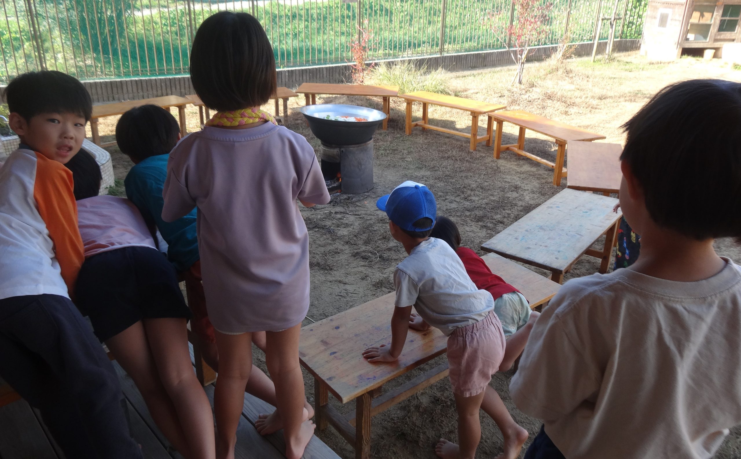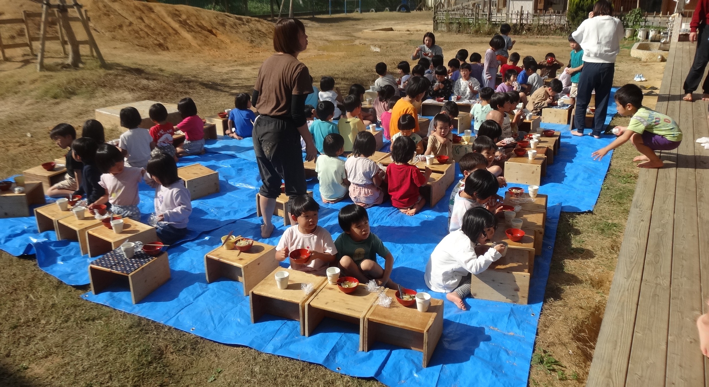 いい天気だったのでみんなで園庭で食べ、おかわりも沢山して美味しく食べました。